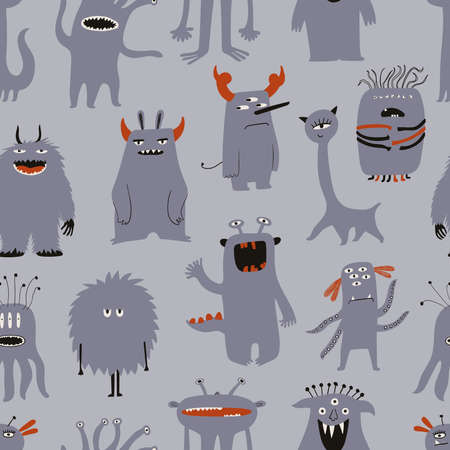Colorful seamless pattern with spooky cute monsters on a gray background. Kids funny wallpaper or print.