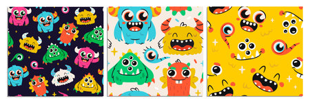 Set of seamless patterns with monsters. Repeating ornaments with adorable furry creatures, mascots and aliens. Design for childrens fabrics. Flat vector illustration collection isolated on background