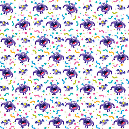 Purple monsters and confetti, seamless pattern on a white background. The aliens birthday. Cheerful childrens multicolored illustrations in cartoon style, hand drawing.