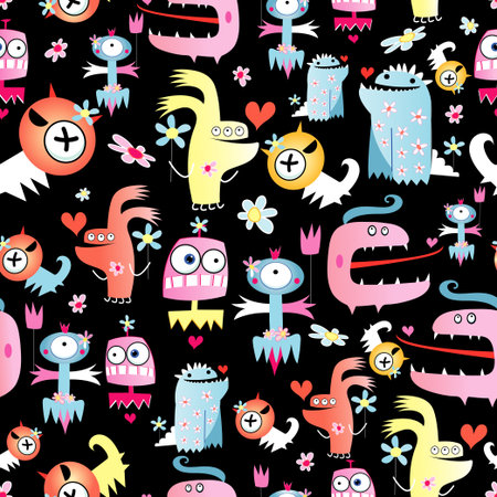 Bright seamless pattern of funny monsters on a black background