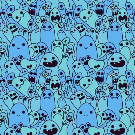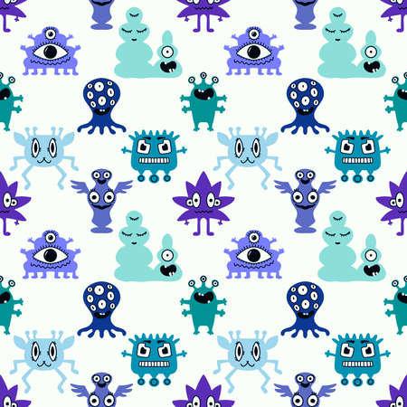 Seamless pattern with funny monsters on a blue background. Vector illustration