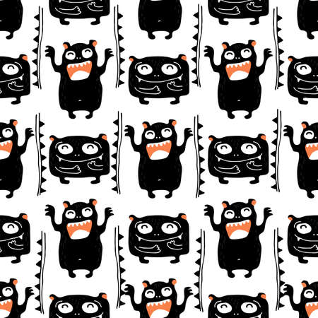 Seamless pattern with funny monsters. Holiday illustration. Horror cartoon. Funny animals. Baby background. Can be used on holidays, birthday design, posters, postcards.