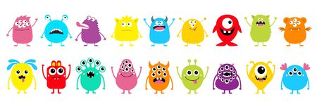 Happy Halloween Monster set line. Cute kawaii cartoon colorful funny scary character icon. Eyes, horns, hands, tongue, fang teeth . Funny baby collection. Flat design. White background Isolated Vector
