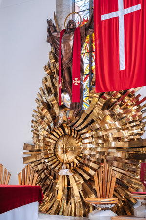 altar with Jesus Christ and cross inside interior of a Christian Catholic church. Cathedral of Sacred Heart of Jesus. Tashkent, Uzbekistan - April 18, 2024
