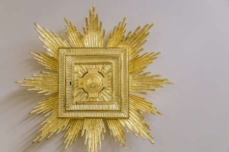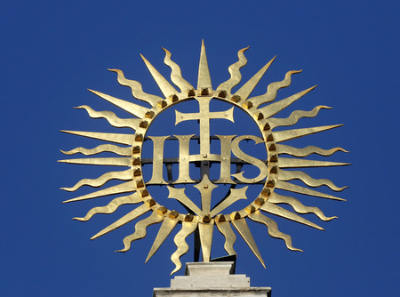 Detail of a golden religious object in the shape of a radiant sun with the IHS symbol
