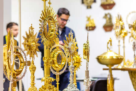 BOLOGNA, ITALY - FEBRUARY 18, 2019: Booth presenter talking with visitor among golden monstrances at stand of NAPOLETANA ARTE SACRA in DEVOTIO exhibition