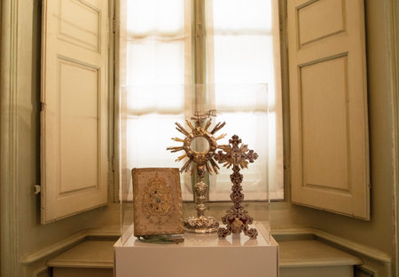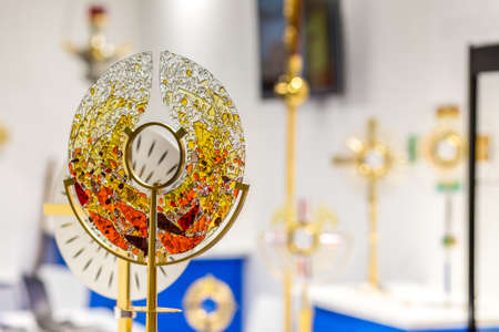 BOLOGNA, ITALY - FEBRUARY 18, 2019: lights are enlightening monstrances at stand of GIOACHINI, in DEVOTIO Religious products and service exhibition
