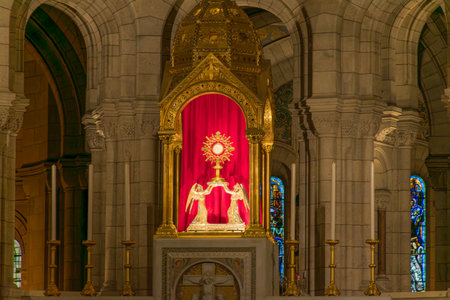 Paris, France - October 14, 2025,The interior of the Sacre-Corur Basilica in Montmartre reveals a solemn and spiritual atmosphere, with decorated vaults, classical columns, and gilded frescoes framing the central dome. The softly filtered natural light enhances the architectural symmetry and the sacred character of the space. Ideal for tourism, editorial, and cultural content about religious heritage, sacred art, and monumental architecture.