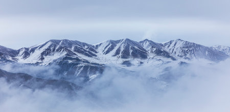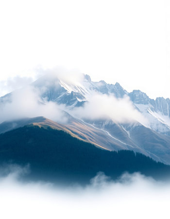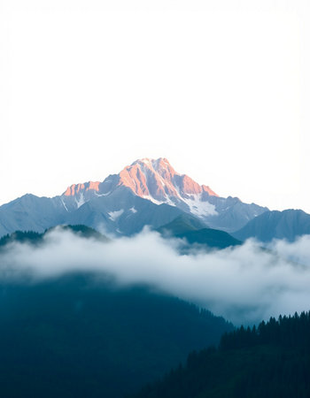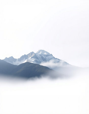 This stunning image captures a snow-capped mountain range bathed in soft morning light. The mist adds a tranquil touch to the expansive landscape, inviting exploration.