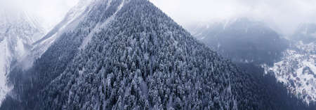 Aerial top view to snowy moutain trees of winter pines in the mountains. Panoramic shot. Middle of the winter. High needles in the forest. Beautiful nature landscape from drone. Dombai, Russia.