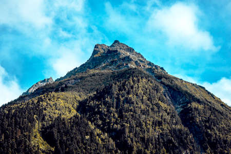Scenic sunny landscape with sunlit coniferous trees on mountain and high snowy sharp pinnacle under cirrus clouds. Beautiful alpine scenery with forest in golden sunshine and mountain top with snow.