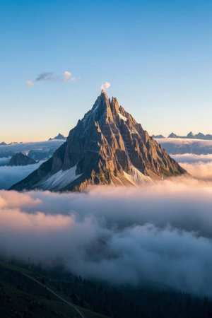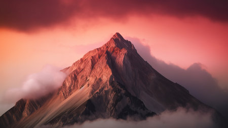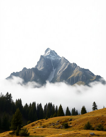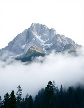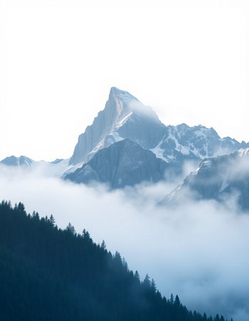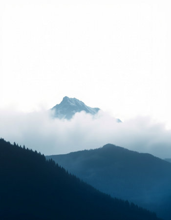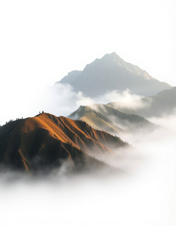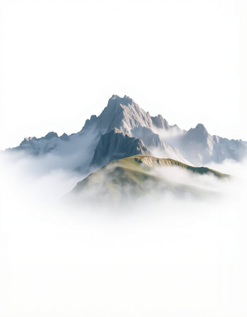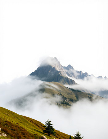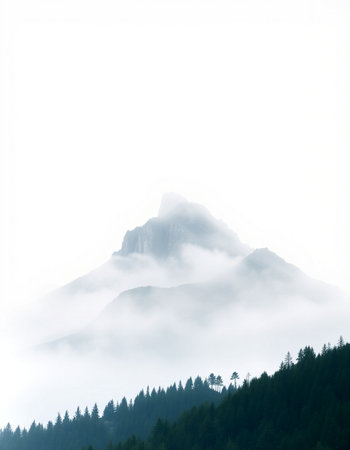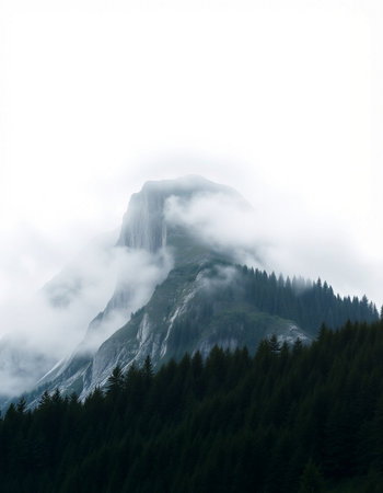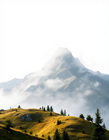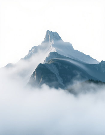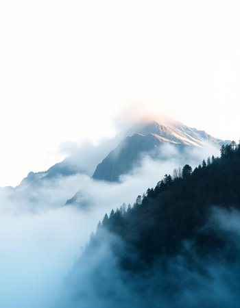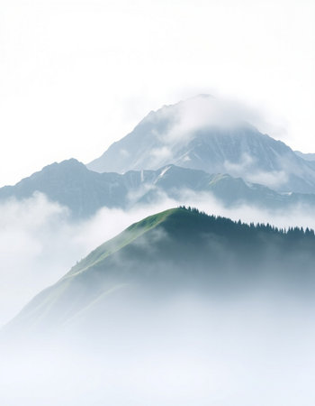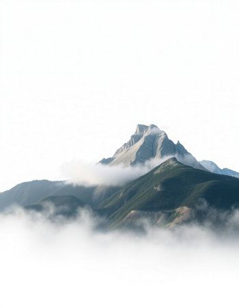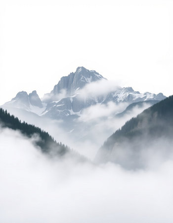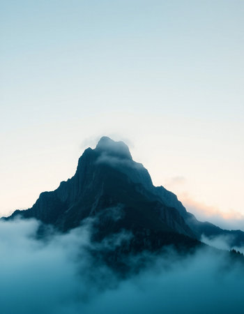 A stunning view of a solitary mountain peak enveloped in mist and fog. The serene landscape embodies tranquility, making it perfect for nature enthusiasts and wanderers.