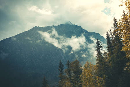 Mysterious landscape the dense fog falling on the mighty Tatras Mountains in Slovakia. Beauty and strength of wild untouched nature. Ideal background for fairy tales illustrations and collages.