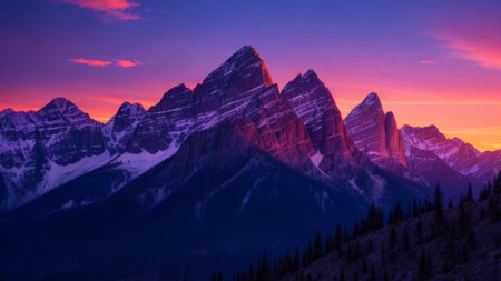 A panoramic shot of snow covered mountain peak with alpine trees at the base of the mountain