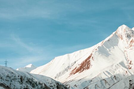 Beautiful sunset view on the high winter mountains peaks, on the sky background. Mountain ice paradise landscape, sunrise light.