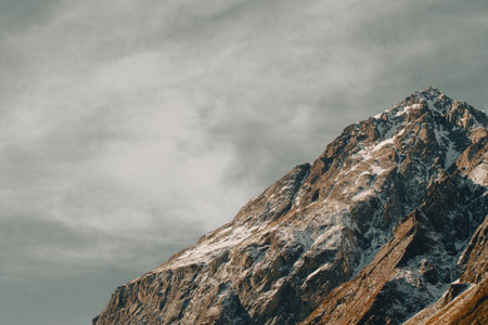 Mountain range under cloudy sky. Snowy peaks of mountains rocks