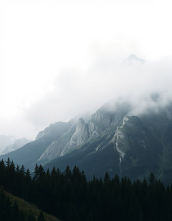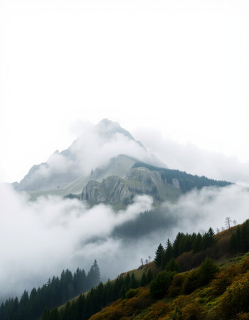 mountain peak in the clouds on a white background, nature series