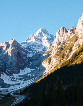 Mountain landscape with snow-capped peaks and coniferous forest