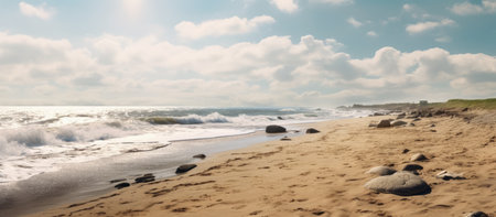 A serene view of a sandy beach with gentle waves rolling in, accentuated by seaweed and smooth stones, under a clear blue sky, perfect for relaxation and travel inspiration.