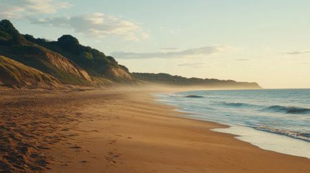 A tranquil beach scene captures golden sands and gentle waves at sunrise. Mist clings to the shore, creating a serene atmosphere perfect for relaxation.
