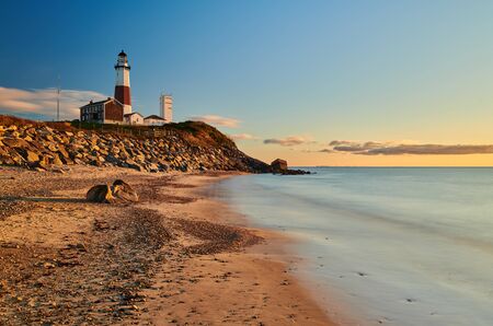 Montauk Lighthouse and beach at sunrise, Long Island, New York, USA.