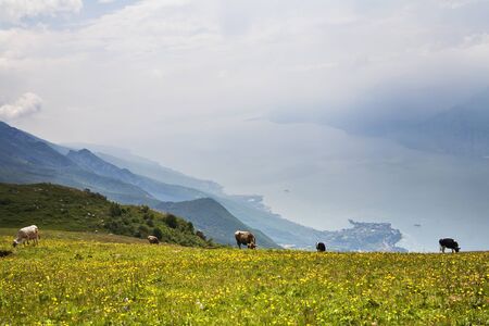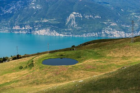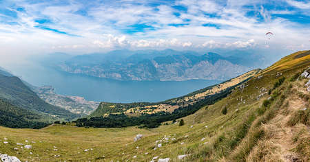 Lake Garda and green pastures in Italian Alps, view from the Monte Baldo. Lombardy and Veneto region, Italy, south Europe