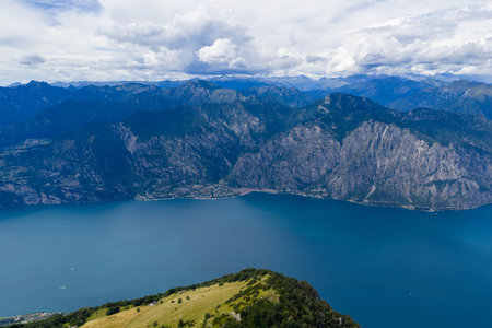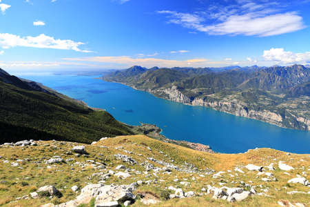 View of Lake Garda from the top of Baldo. Beautiful blue water, sky and sharp mountain peaks (Alps and Dolomites)