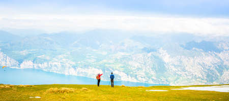 Aerial drone shot of tourists hikers and paragliders on top of Monte Baldo in Lake Garda Area