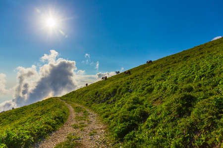 Scenery mountain landscape at Caucasus mountains with horses