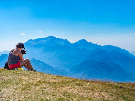 Rear view of man taking photograph of mountains, Passo Maniva, Italy
