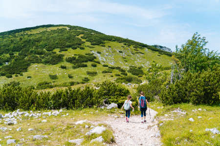 Children hiking on beautiful summer day in alps mountains Austria, resting on rock and admire amazing view to mountain peaks. Active family vacation leisure with kids. Outdoor fun and healthy activity