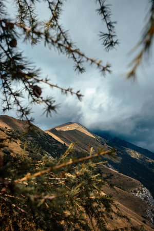 The view of rainy clouds above mountain landscape.