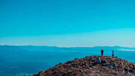 the peaks of the Alps around Lake Garda surrounded by fog with blue sky seen from Monte Altissimo, Trento, Italy