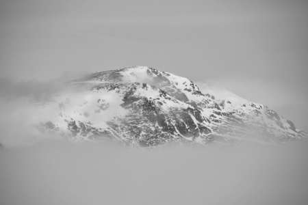 A beautiful shot of foggy and cloudy high rock mountains during winter
