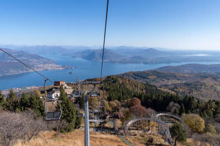View of Cableway Stresa-Mottarone and Lake Maggiore from elevated position in the area of Stresa city, Piedmont region, Italy. The Cable Car and is one of the best ways to view Lake Maggiore