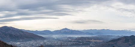 Amazing drone aerial landscape at the Italian Alps in winter and autumn. Morning panorama. Fall sunrise at the alps with moisture and pollution in the air. Silhouette of the mountains and hills
