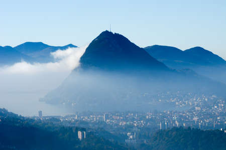 Panorama view of Monte San Salvatore mountain hill from Monte Bre at Lago di Lugano lake in Ticino Switzerland Italy Europe