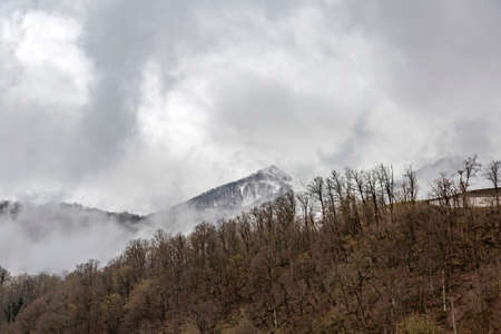 Mountain landscape with fog and clouds. Caucasus Mountains, Georgia.