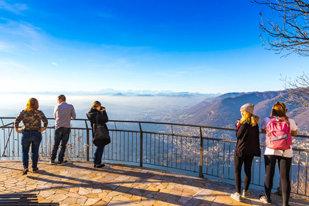 Como, Italy - December 2, 2016: Viewpoint near Volta's Lighthouse in Brunate village, Como, Lombardy province. Picturesque view of Como lake and Alps