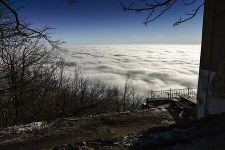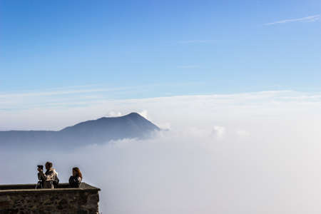 The top of the mountain with a geodesic sign rises above the fog with blue sky background