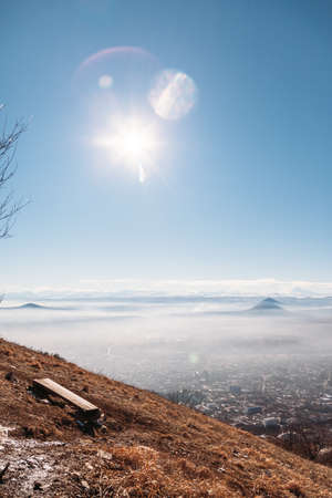 View from the mountains to the mountains, the city and sun at sunset. Bird's-eye view above the clouds.