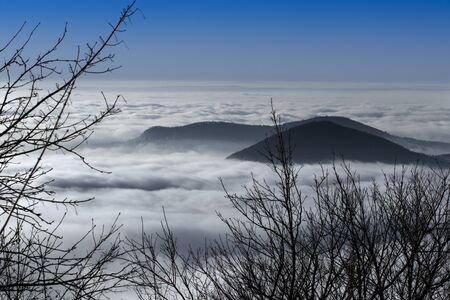 Blue toned mountain range with fog and mist covering the valleys below. Soft light and cold feeling. Italian Alps in autumn.