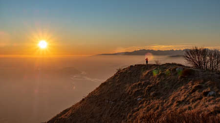 Hiker relaxing on the mountain summit at sunset and looking at majestic panorama of the italian Alps in autumn season. Wide angle view. Concept of conquering the success and healthy lifestyle.