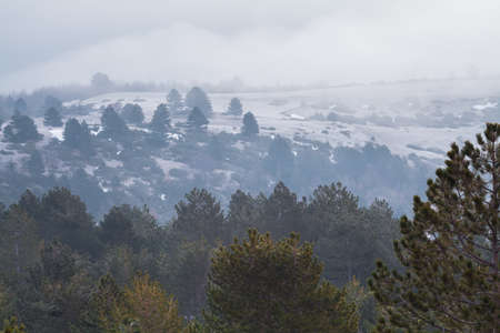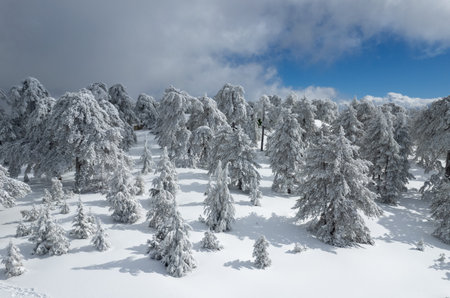 Snow-covered forest on top of mountain Ai-Petri after blizzard in spring. Crimea