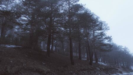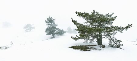 Pine trees in the fog. Snow. Winter landscape. Monochrome image