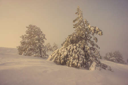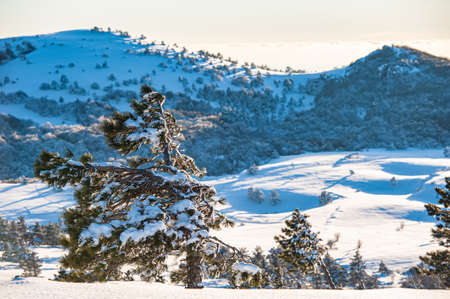 Winter landscape with a pine tree on the mountain. Beautiful snow-covered pine tree on the edge of the cliff. Trees are higher than clouds. Mountain landscape. Crimean pine with long needles.