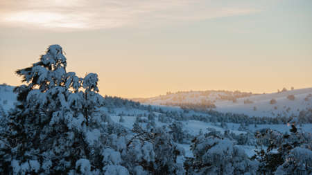 Snowy landscape in the evening in the mountains. Winter season. Crimea. Ukraine. Web banner.