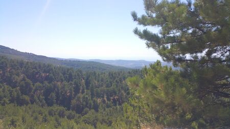 Scenic view of Divcibare mountains with pine trees and clear summer sky. Nature travel destination in Serbia
