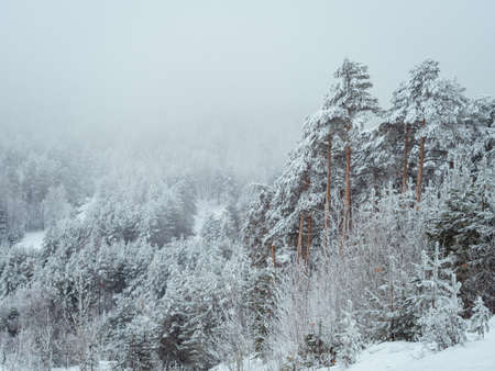 Frosty morning forest and mountains. Winter landscape foggy morning in pine forest