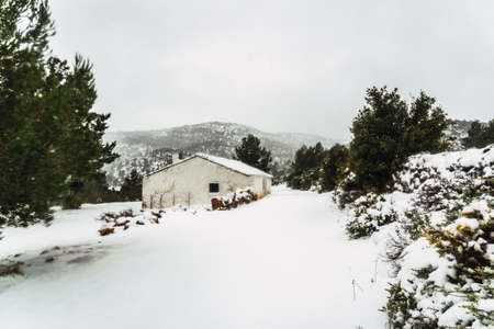Winter Landscape, idyllic landscape with snow covering the cliff and a beautiful lodge at Troodos mountains Cyprus